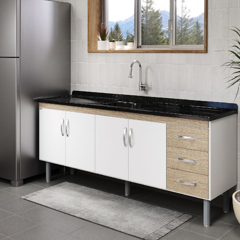 Instalação: A montagem deve ser realizada conforme o manual de instruções que acompanha o produto, preferencialmente sobre superfície plana e nivelada. Os pés em ABS com rosca permitem ajuste de altura, garantindo melhor adaptação ao piso e maior estabilidade. Para preservar a qualidade do móvel, recomenda-se evitar exposição constante à água, principalmente nas junções e extremidades. A limpeza deve ser feita com pano macio levemente umedecido e sabão neutro, evitando o uso de produtos abrasivos, esponjas de aço ou químicos agressivos que possam danificar o acabamento UV. Caso seja instalada pia (vendida separadamente), é recomendável contar com um profissional qualificado para assegurar vedação adequada e manter a integridade da estrutura. Com estrutura reforçada, excelente acabamento e amplo espaço interno, o Armário de Cozinha Tóquio 192,2cm Cerejeira é a escolha certa para quem busca qualidade, organização e durabilidade em um único produto.