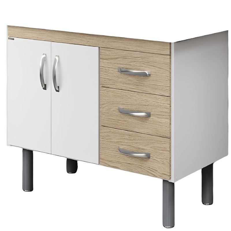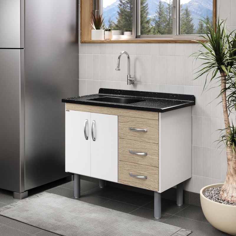 Os pés em ABS com rosca facilitam o nivelamento do armário, proporcionando melhor ajuste ao piso e maior estabilidade. As três gavetas oferecem espaço funcional para organização de utensílios, talheres e acessórios de cozinha, mantendo tudo sempre ao alcance das mãos.