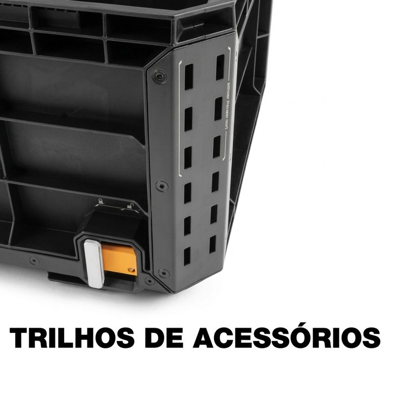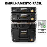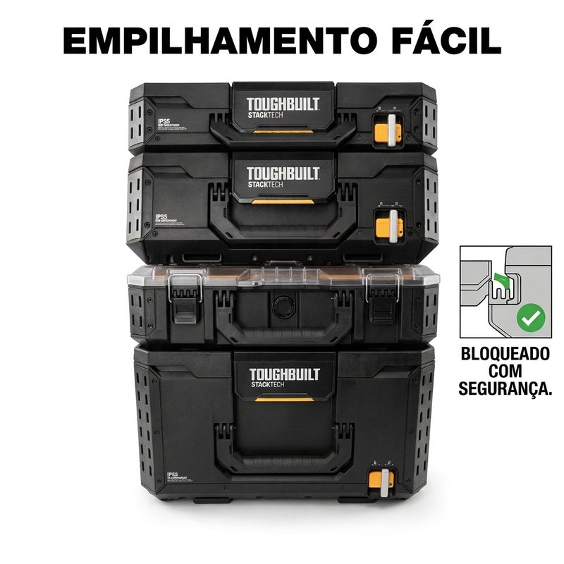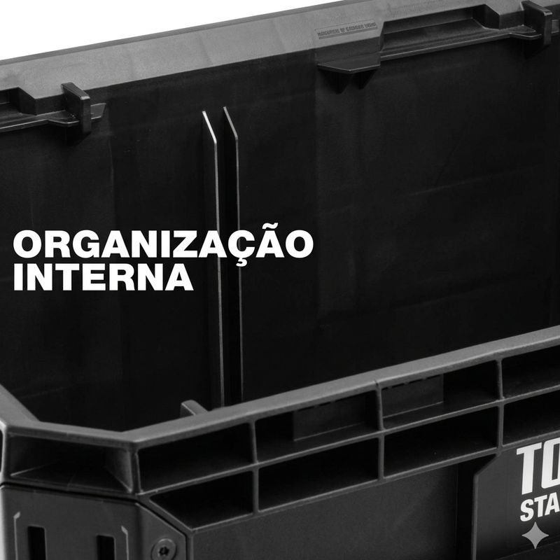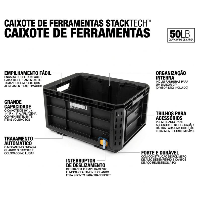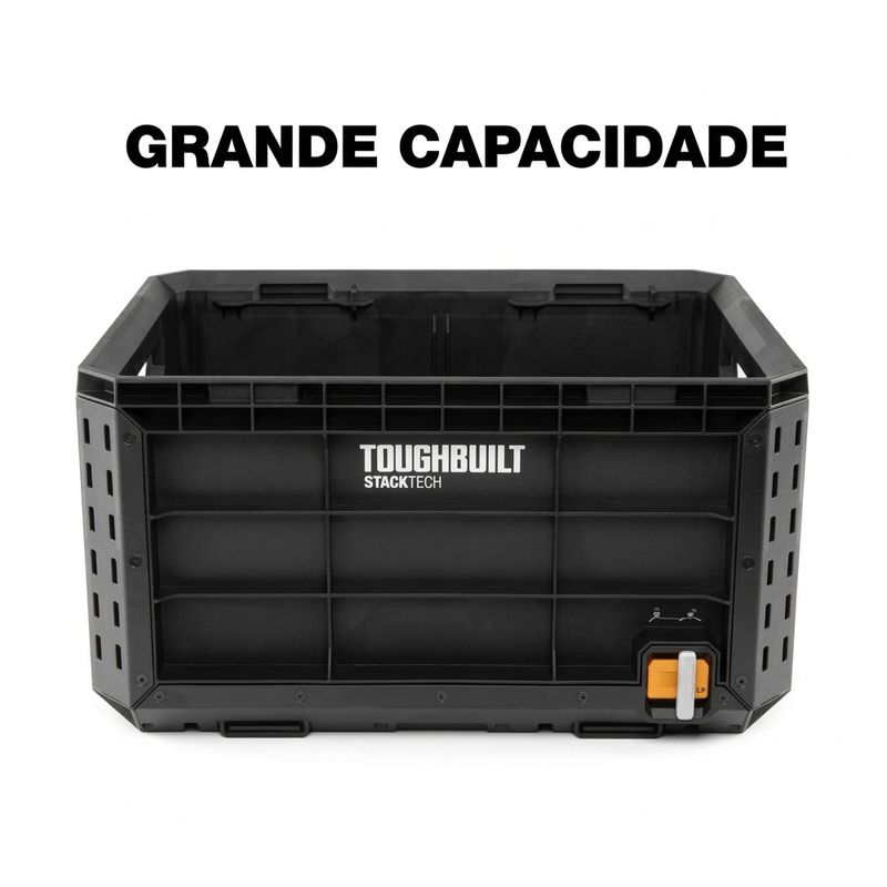 Descrição: A Caixa Uso Geral Modular StackTech - TB-B1-X-50 - TOUGHBUILT BRASIL é uma solução profissional desenvolvida para armazenamento e transporte de ferramentas, equipamentos e materiais de grande volume. Fabricada com estrutura robusta em polímero de alto desempenho e cantos blindados reforçados, essa caixa oferece alta resistência a impactos e excelente durabilidade para ambientes de trabalho exigentes. Seu design tipo “crate” aberto maximiza o espaço interno, permitindo acomodar itens maiores que normalmente não caberiam em caixas convencionais. O modelo possui base autoalinhável com sistema de empilhamento StackTech™, que permite encaixe automático em outras caixas da linha, além de interface de travamento automático com indicador de segurança, garantindo estabilidade durante o transporte.
