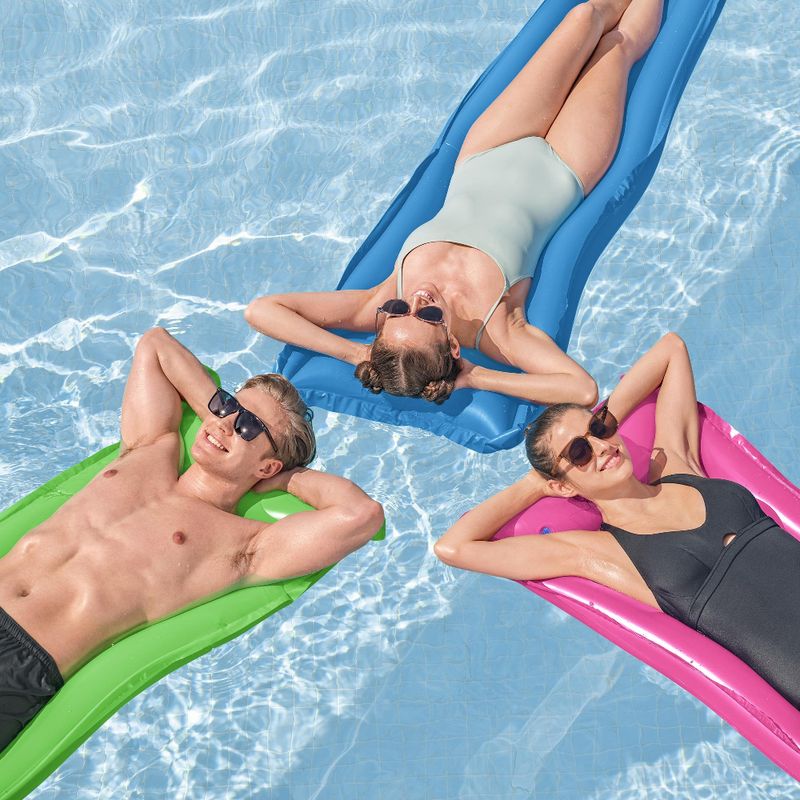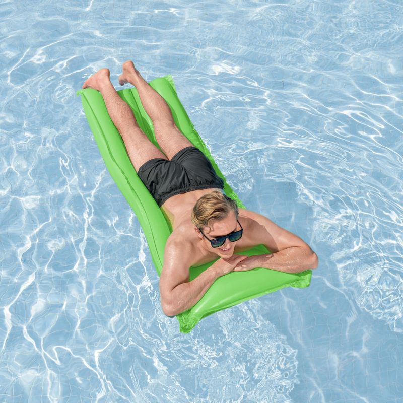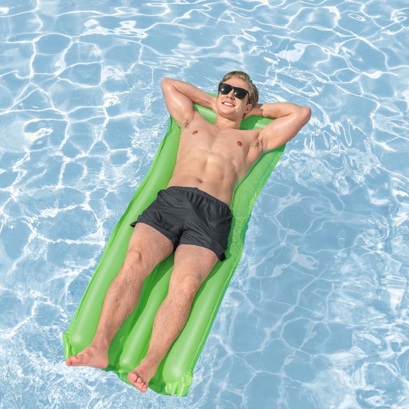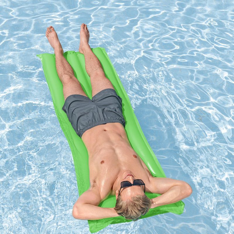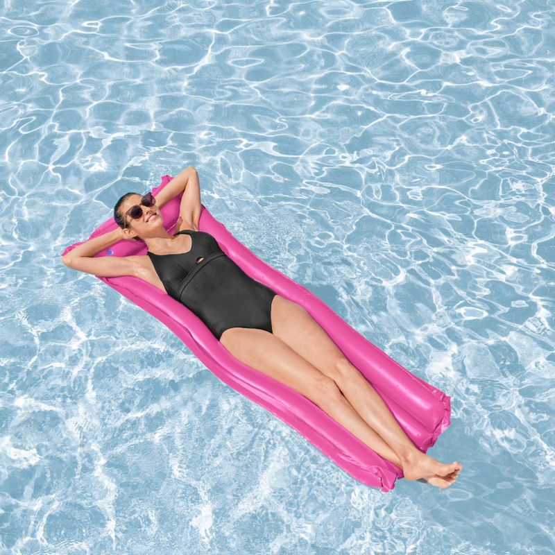 Indicação de uso: O Colchão Bronzeador Liso Matte Bestway é indicado para uso em piscinas, praias, chácaras e áreas de lazer, proporcionando conforto durante o banho de sol ou momentos de relaxamento na água. Seu formato alongado garante melhor acomodação do corpo, permitindo relaxar com estabilidade. Por ser leve e compacto quando desinflado, é fácil de transportar e guardar, sendo ideal para levar em viagens e passeios.