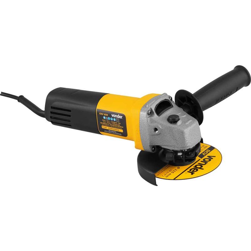 Esmerilhadeira Angular 4.1/2" 650 Watts 110 Volts EAV 650 com Disco - 6001065127 - VONDERDescrição:A Esmerilhadeira Angular Vonder EAV 650 é a escolha ideal para quem busca desempenho, durabilidade e segurança em trabalhos de corte, desbaste e acabamento em superfícies metálicas. Com potência de 650 W, disco de 4.1/2" (115 mm) e rotação de 11.000 rpm, ela garante excelente performance em aplicações profissionais e domésticas.Seu design ergonômico proporciona conforto e controle, com punho auxiliar de 2 posições, além de dupla isolação elétrica, seguindo as normas ABNT NBR IEC 60745-1 e 60745-2-3, assegurando maior proteção durante o uso. Compacta e leve, é ideal para trabalhos contínuos e de alta precisão.