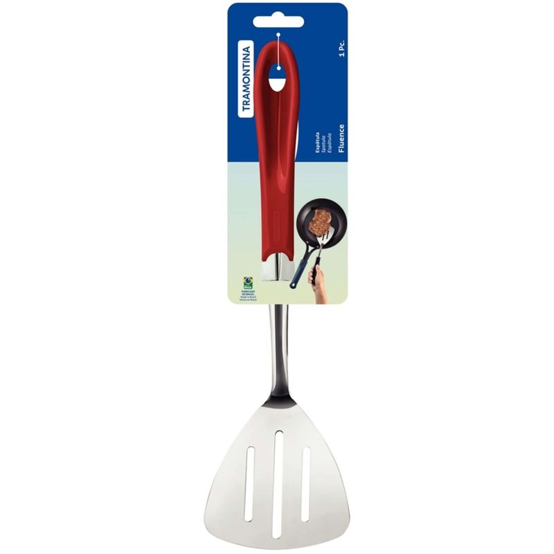 A Tramontina trouxe a linha Fluence com a intenção de trazer praticidade e qualidade para sua cozinha. A espátula deles desse modelo com sua lâmina em aço inox e cabo em polipropileno vermelho é a escolha ideal para preparar e servir suas refeições com muito mais cor e qualidade. Em sua composição a lâmina em aço inox e cabo de polipropileno com furo passante, é garantida maior resistência e praticidade, pois pode ser levada à máquina de lavar louças e ser levada à máquina de lavar louças.