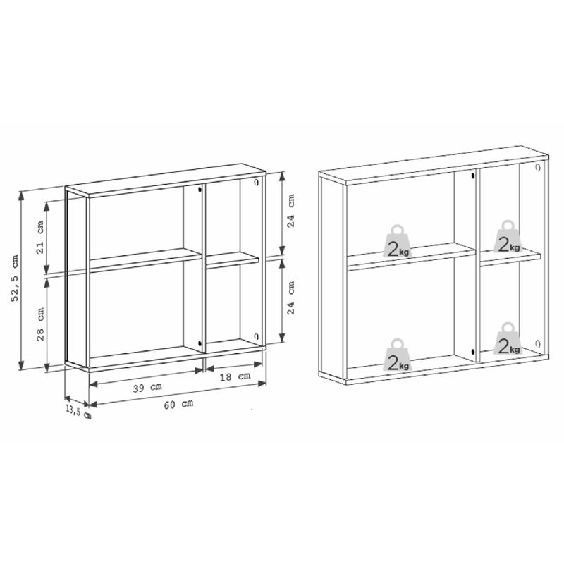 Dimensões: 60 cm de largura, 52,5 cm de altura e 13,5 cm de profundidade;
