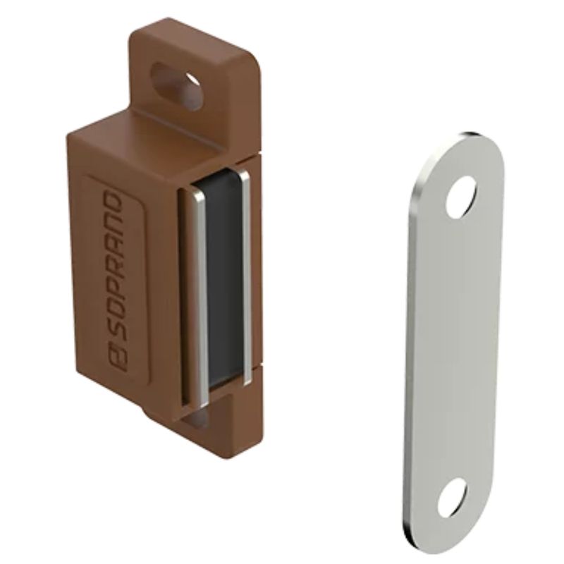 Fecho magnético marrom da Soprano em embalagem autosserviço com 4 unidades O fecho magnético marrom com batente dois furos proporciona o travamento de portas através de um imã instalado entre duas presilhas de aço, fazendo contato com o batente fixado na porta. Este fecho magnético é o mesmo produto código 06030.0030.86 de nosso portfólio, porém em embalagem autosserviço de fácil manuseio e quantidade fracionada.
