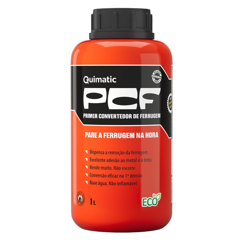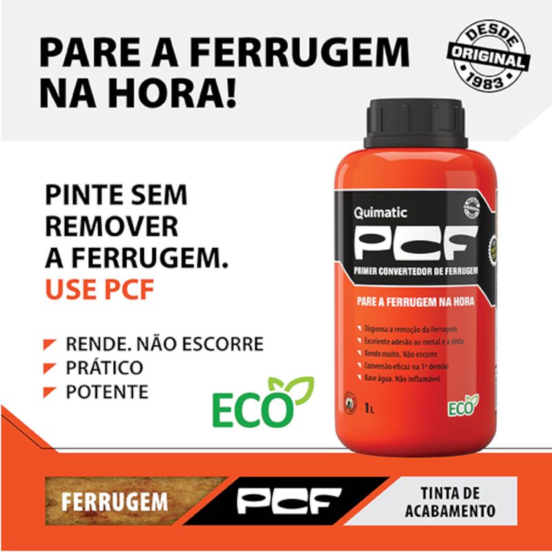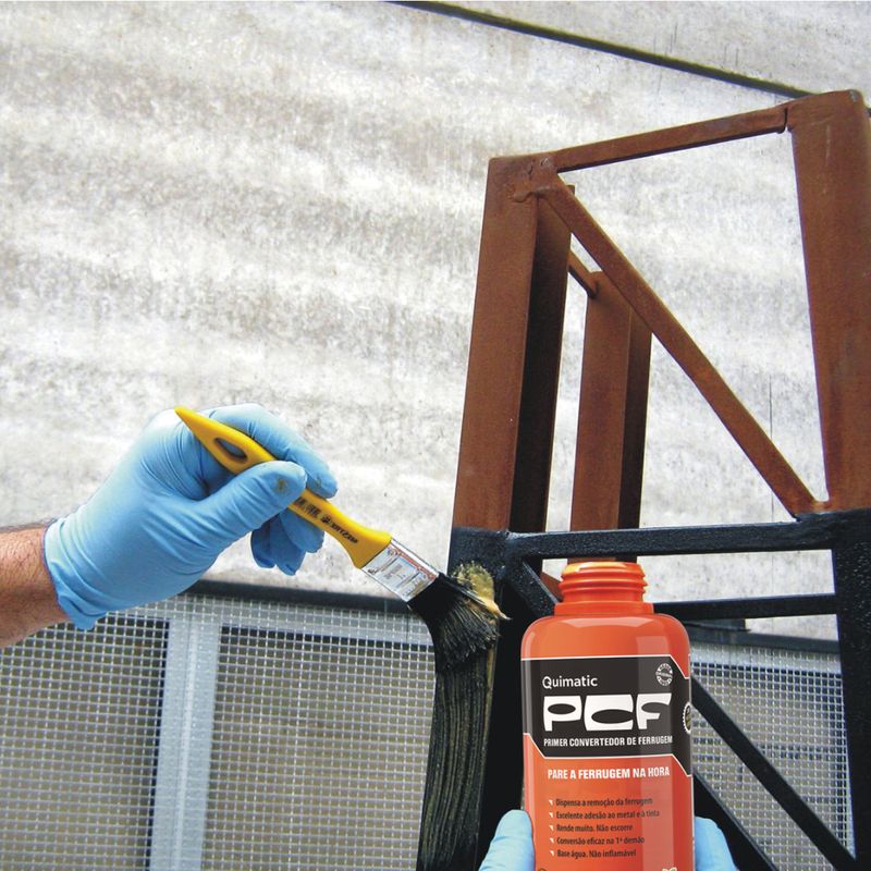 - O PCF da Quimatic transforma a ferrugem em um fundo pronto para receber uma tinta à base de esmalte sintético, epóxi ou PU. Sua fórmula exclusiva aliada à resina acrílica oferecem uma excelente adesão da tinta e do fundo com um ótimo nivelamento e acabamento. O PCF substitui o jateamento e o enorme esforço de lixamento para remoção de ferrugem em grandes áreas ou em áreas de risco de incêndio por fagulhas de esmerilhamento.