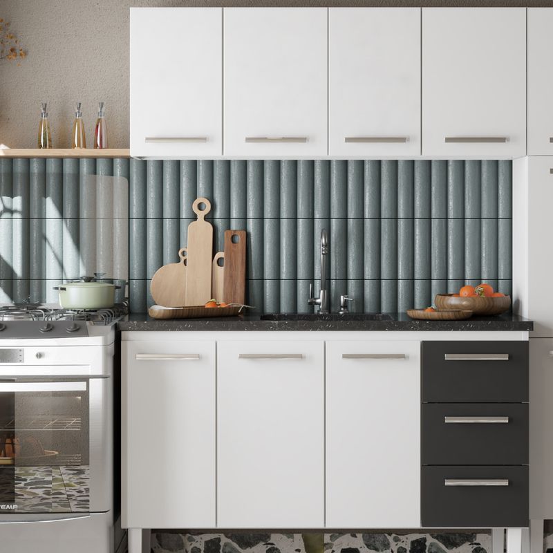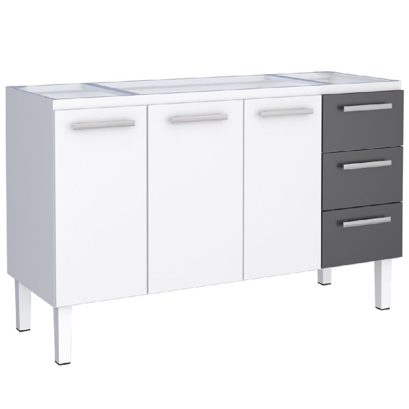 As três portas e três gavetas proporcionam excelente distribuição interna, permitindo armazenar utensílios, panelas, produtos de limpeza e acessórios de forma prática e acessível. A prateleira interna amplia a capacidade de organização, enquanto o divisor de talheres contribui para manter os itens sempre organizados e ao alcance das mãos. Os puxadores em ABS com acabamento metalizado complementam o design moderno e garantem maior conforto no uso diário.