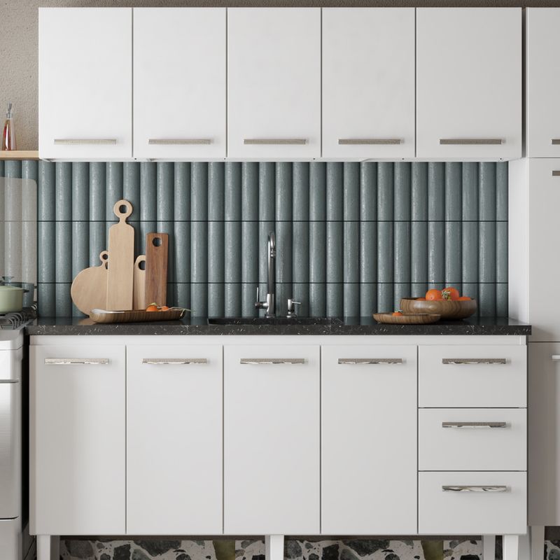 O gabinete conta com passagem para sifão, tornando a instalação hidráulica mais simples e organizada, sem necessidade de adaptações improvisadas. As quatro portas oferecem amplo espaço para armazenar panelas, utensílios, eletroportáteis e produtos de limpeza, enquanto as três gavetas facilitam o acesso a itens menores. O divisor de talheres proporciona organização prática no uso diário, e a prateleira interna otimiza o aproveitamento do espaço, permitindo melhor distribuição dos objetos.