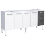 O gabinete conta com passagem para sifão, tornando a instalação hidráulica mais simples, organizada e funcional, sem a necessidade de adaptações improvisadas. As quatro portas oferecem amplo espaço para armazenar panelas, utensílios maiores, eletroportáteis e produtos de limpeza, enquanto as três gavetas proporcionam praticidade no acesso a itens menores e de uso frequente. O divisor de talheres contribui para manter a organização no dia a dia, trazendo mais funcionalidade à rotina da cozinha. Já a prateleira interna otimiza o aproveitamento do espaço, permitindo melhor distribuição dos objetos e maior facilidade de acesso.