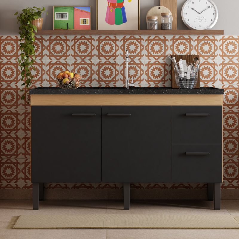 O Gabinete Cozimax Sabiá Jequitibá Preto é indicado para uso em cozinhas residenciais, sendo ideal para quem deseja organizar utensílios, panelas e mantimentos de forma prática e eficiente. Suas gavetas mais altas, equipadas com corrediças telescópicas, proporcionam abertura suave, silenciosa e resistente, garantindo conforto no uso diário. As duas portas frontais permitem fácil acesso ao espaço interno, tornando o móvel funcional mesmo em cozinhas compactas. Por ser entregue montado, a instalação é simples e rápida, bastando posicioná-lo corretamente no local desejado. Para a instalação, recomenda-se que o piso esteja nivelado, utilizando a regulagem de altura dos pés para garantir perfeito alinhamento com a pia e estabilidade do conjunto. A fixação da pia deve seguir as instruções do fabricante da cuba, utilizando silicone ou vedantes apropriados para evitar infiltrações.