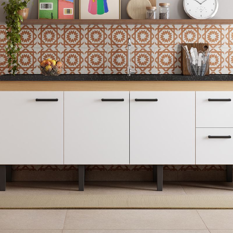 Com gavetas equipadas com corrediças telescópicas, o gabinete oferece abertura suave, maior resistência e facilidade no acesso aos utensílios, panelas e itens do dia a dia. As três portas ampliam o espaço de armazenamento, tornando o ambiente mais organizado e funcional. O puxador arredondado em poliestireno reforça o design moderno e garante conforto no manuseio.