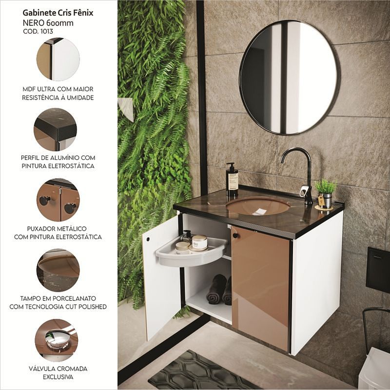 O Gabinete Fênix Nero da Cris-Metal é a fusão perfeita entre estética sofisticada e funcionalidade inteligente para sua cozinha. Este gabinete possui medidas planejadas de 60cm de largura, 49cm de altura e 42,5cm de profundidade, combinando materiais premium como porcelanato polido na cor Nero, perfis de alumínio com pintura eletrostática Black e portas em vidro capuccino com película protetora. Sua cuba é embutida em vidro moldado na mesma cor, proporcionando um visual integrado e moderno. A estrutura interna em MDF Ultra oferece alta resistência à umidade, enquanto os detalhes em puxador metálico e válvula cromada exclusiva garantem durabilidade e elegância.