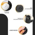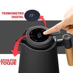 Seu design moderno conta com cabo imitando madeira e tela LED touch na tampa, que exibe em tempo real a temperatura interna – sem necessidade de recarga, graças à bateria de longa duração já integrada.
