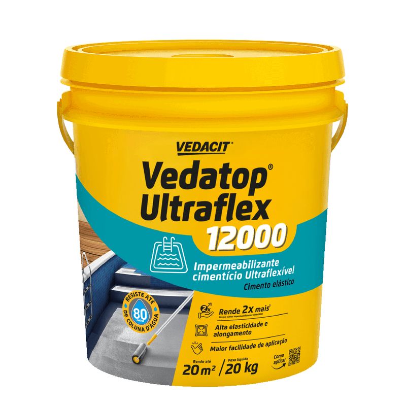 O Vedatop Ultraflex Vedacit 20 kg é indicado para áreas externas e internas, como lajes expostas, fachadas, paredes, calhas, áreas frias e de serviço (banheiros, cozinhas e lavanderias), piscinas, reservatórios, áreas enterradas e elevadas. É extremamente eficaz em arremates de ralos, tubulações em PVC ou metal, juntas de concretagem, rodapés e fundos de reservatórios. Para lajes acima de 40 m² ou áreas sujeitas a movimentações constantes, recomenda-se o uso combinado com a Vedacit Manta Estruturante, garantindo maior resistência à tração e melhor distribuição das tensões.