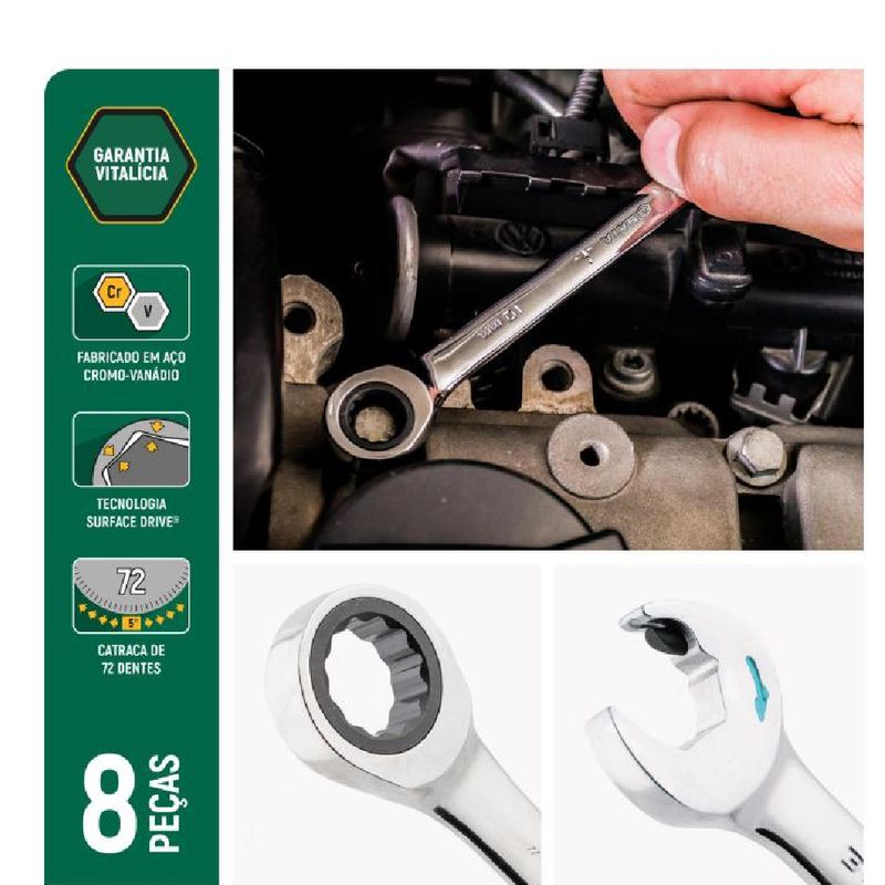 Para aplicação e uso, o Jogo de Chave Combinada Speedy com Catraca é indicado para serviços automotivos, manutenção industrial, montagem de estruturas metálicas, reparos domésticos e diversas atividades que envolvam aperto e desaperto de porcas e parafusos sextavados. O sistema Speedy proporciona maior produtividade ao permitir o movimento contínuo sem a necessidade de retirar a chave da peça, reduzindo o esforço e o tempo de trabalho. Já a catraca com 72 dentes permite operar com apenas 5° de movimento, sendo ideal para locais de difícil acesso ou com pouco espaço, onde ferramentas convencionais exigiriam maior amplitude. A tecnologia Surface Drive® é outro grande diferencial, pois distribui a força de forma mais eficiente nas superfícies planas dos parafusos, evitando o desgaste e prolongando a vida útil tanto da ferramenta quanto dos fixadores. Para melhor desempenho, recomenda-se utilizar sempre a chave com a medida correta do parafuso, evitando folgas que possam comprometer a eficiência ou causar danos. O armazenamento no estojo termoplástico facilita o transporte e mantém as ferramentas organizadas, evitando perdas. Para conservação, é indicado limpar as peças após o uso e armazená-las em local seco, garantindo maior durabilidade do acabamento cromado. Com alta qualidade, tecnologia avançada e excelente desempenho, este jogo de chaves é indispensável para quem busca produtividade, resistência e precisão em qualquer tipo de trabalho.