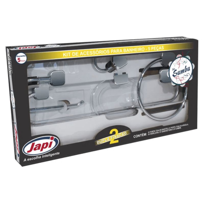 Descrição: O Kit Acessórios para Banheiro Samba Quadrado Cromado 5 Peças – JKSQC – Japi é a solução ideal para quem busca organização, praticidade e um visual moderno para o banheiro ou lavabo. A linha Samba é composta por um mix completo de acessórios que facilitam o dia a dia, mantendo o ambiente mais funcional e harmonioso. Com design quadrado e acabamento cromado, o kit combina com diferentes estilos de decoração, agregando elegância e sofisticação ao espaço. Produzido com plásticos de engenharia (PS) e alumínio, oferece resistência, leveza e durabilidade. Suas medidas aproximadas são 44 x 22 x 5 cm, garantindo excelente aproveitamento do espaço sem comprometer a circulação no ambiente.