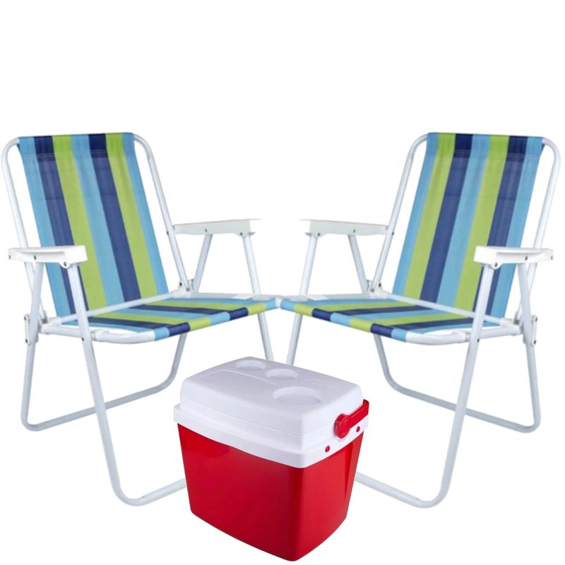 Kit de Praia com Caixa Térmica de 18 Litros Vermelha + 2 Cadeiras de Praia Alta em Aço Cores Sortidas