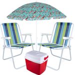 Kit de Praia com Caixa Térmica de 18 Litros Vermelha + 2 Cadeira de Praia Alta em Aço Cores Sortidas + Guarda Sol 1.50 Metros Sortidos