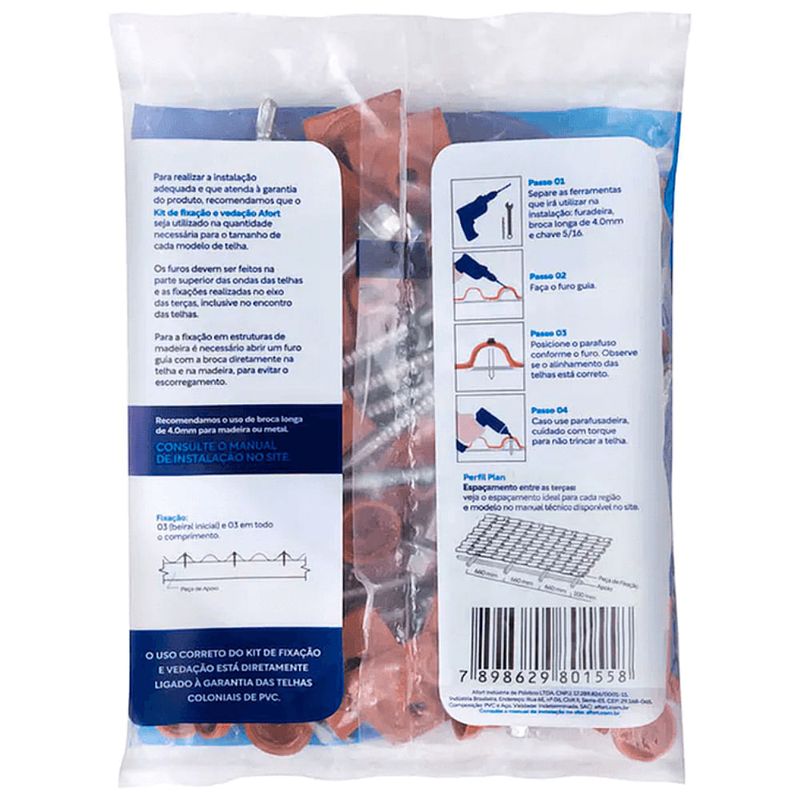 Descrição: O Kit Fixação e Vedação Afort Plan Colonial Terracota é especialmente desenvolvido para proteger e fixar telhas coloniais ou telhas tipo “Plan / Colonial” de PVC ou cerâmica, na cor terracota. Composto por parafusos autobrocantes, arruelas plásticas, borrachas de vedação e chapéus protetores, esse kit garante estanqueidade, vedação contra infiltrações e fixação segura das telhas, preservando a integridade da cobertura.