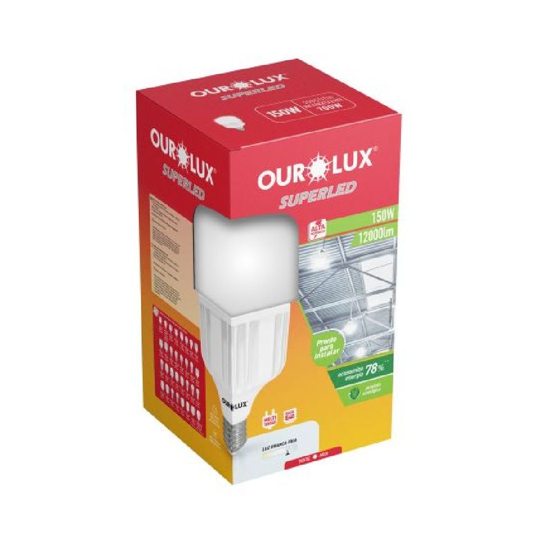 A Lâmpada SuperLED Alta Potência 150W 6500K E40 OUROLUX é recomendada para ambientes cobertos com pé-direito alto, como galpões, armazéns, supermercados, igrejas, oficinas, centros logísticos, quadras cobertas e áreas industriais leves. Seu alto fluxo luminoso de 12.000 lúmens e ângulo de abertura de 200° proporcionam excelente distribuição da luz, reduzindo sombras e garantindo iluminação uniforme e eficiente.