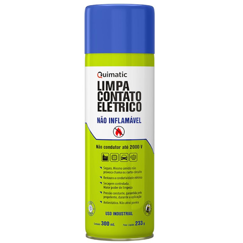 - O Limpa Contato Elétrico Não Inflamável da Quimatic não propaga chama (até 7000Volts), oferecendo máxima segurança contra explosões e curtos circuitos. Remove sujeira, poeira, umidade e oleosidade contribuindo para restauração da condutividade dos contatos elétricos com máxima segurança. O produto penetra, limpa e evapora rapidamente sem deixar resíduo. Por conter na sua fórmula agente antiestático que repele a sujeira, a superfície fica limpa por mais tempo.