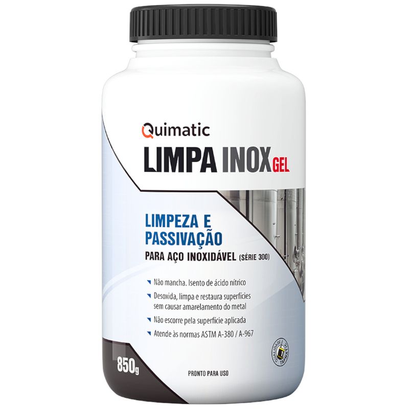 - O Limpa-Inox GEL da Quimatic é o produto ideal para remover ferrugem, manchas e sujeira incrustada. Destaca-se entre os produtos concorrentes por não conter ácido nítrico na composição, substância responsável pelo manchamento acentuado da superfície. O Limpa-Inox GEL é indicado para a desoxidação e limpeza de superfícies grandes ou pequenas de aço inoxidável da série 300 (austeníticos) em todas as suas formas e para séries 400 e 500 recomenda-se a verificação da compatibilidade com a superfície antes da aplicação.