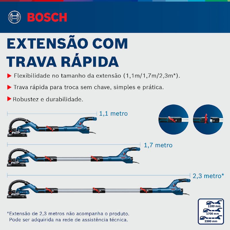 Descrição: Apresentamos a Lixadeira de Parede GTR 550 da Bosch, uma ferramenta elétrica profissional projetada especificamente para lixamento rápido, uniforme e com mínimo esforço em superfícies grandes de drywall, gesso e massa corrida. Seu corpo principal é fabricado em plásticos de engenharia de alta resistência, combinado com componentes metálicos nos pontos críticos, garantindo robustez e durabilidade mesmo em ambientes de trabalho exigentes. O acabamento é na cor azul e preto, característica da linha profissional Bosch, com uma ergonomia pensada para proporcionar um conforto excepcional durante o uso prolongado. A lixadeira é alimentada por um potente motor de 550 Watts que proporciona um desempenho superior na remoção de materiais. Seu design compacto, com uma base lixante de formato triangular, permite alcançar cantos e áreas de difícil acesso com grande eficiência. A máquina opera com uma velocidade de até 2000 rotações por minuto e possui um sistema de aspiração integrado que se conecta diretamente a um aspirador de pó industrial, reduzindo significativamente a poeira no ambiente. O produto inclui uma prática maleta de transporte Bosch para armazenamento seguro e deslocamento, sendo a ferramenta ideal para pedreiros, pintores e instaladores de drywall que buscam produtividade e um acabamento de alta qualidade.