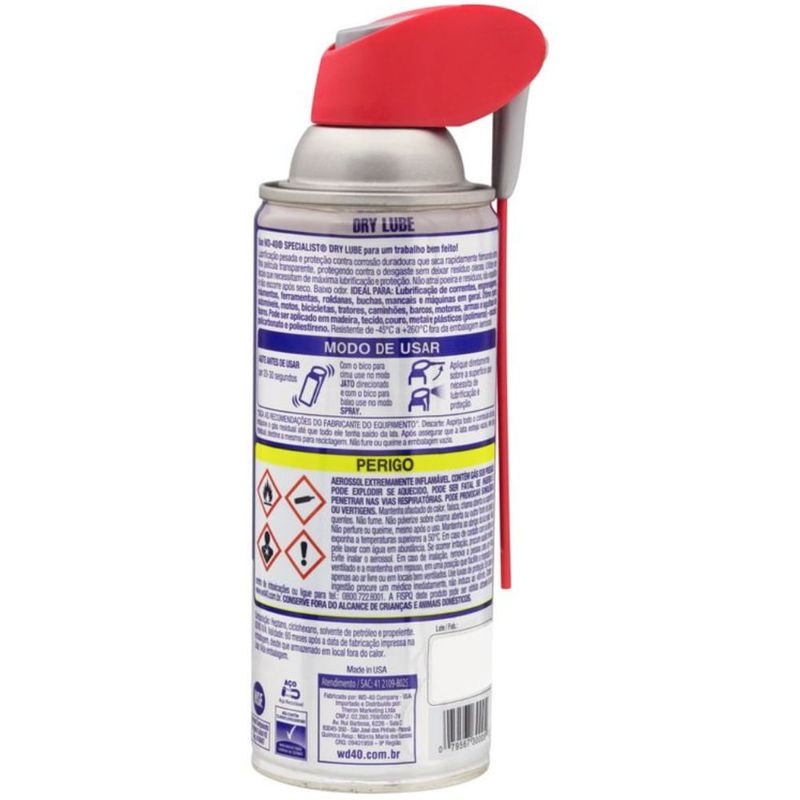 Apresentamos o Lubrificante a Seco DRY LUBE da linha WD-40 Specialist, a solução profissional de alta performance para lubrificação limpa, seca e de longa duração em equipamentos críticos. Este produto é formulado com tecnologia de lubrificação seca que cria uma película lubrificante fina e resistente sem conter PTFE, evitando o acúmulo de poeira, sujeira e resíduos oleosos. Sua embalagem aerossol de 400ml oferece aplicação prática e precisa, com bico multidirecional para alcançar áreas de difícil acesso. O lubrificante seca rapidamente após a aplicação, protegendo contra atrito, desgaste e corrosão em uma ampla faixa de temperatura, resistindo de -45°C a 260°C. É certificado NSF H2, podendo ser utilizado com segurança em maquinários de indústrias alimentícias. Ideal para correntes, guias, polias, dobradiças, ferramentas elétricas e qualquer aplicação que exija lubrificação limpa e de alto desempenho.
