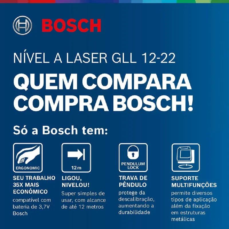 Descrição: O Nível a Laser Bosch GLL 12-22 é uma ferramenta prática, precisa e extremamente eficiente, ideal para quem busca agilidade e qualidade em instalações e marcações em ambientes internos. Fabricado com estrutura em plástico resistente, borracha e componentes em vidro, o equipamento oferece durabilidade e conforto no manuseio. Seu laser vermelho de classe 2 garante excelente visibilidade, enquanto o acabamento robusto assegura maior vida útil mesmo em uso frequente. Com alcance de até 12 metros, o Bosch GLL 12-22 permite executar medições e alinhamentos com alto nível de precisão, eliminando a necessidade de riscar paredes ou contar com ajudantes. Compacto e funcional, o equipamento possui suporte giratório integrado, facilitando o posicionamento em diferentes ângulos e superfícies. Desenvolvido para profissionais e usuários que estão iniciando no uso de níveis a laser, este modelo combina tecnologia Bosch, confiabilidade e ótimo custo-benefício.