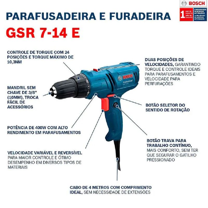 Parafusadeira e Furadeira GSR 7-14E 400 Watts 110 Volts com Cabo de 4 Metros - 06014470D0 - BOSCH Descrição: Apresentamos a Parafusadeira e Furadeira Bosch GSR 7-14 E, uma ferramenta elétrica versátil e inteligente, projetada para ser a companheira ideal de profissionais e entusiastas que valorizam precisão, controle e praticidade em montagens, instalações e reparos. Com um motor de 400 Watts e voltagem de 127 Volts, esta ferramenta é fabricada com uma combinação de materiais de alta qualidade: uma estrutura robusta em poliamida reforçada, componentes internos metálicos de precisão e acabamentos ergonômicos em elastômero. Seu design, no clássico azul Bosch, oferece uma pegada confortável e antiderrapante. A ferramenta é compacta, com dimensões de 20,4 cm de altura, 6,8 cm de largura e 21,4 cm de profundidade, e incrivelmente leve, facilitando o manuseio em espaços apertados e o uso acima da cabeça sem causar fadiga. Equipada com um mandril sem chave de 10mm (capacidade para brocas de até 10mm), sistema de 2 velocidades e um cabo longo de 4 metros, ela elimina a necessidade de extensões em boa parte dos trabalhos, proporcionando liberdade de movimento e uma solução completa e pronta para uso.
