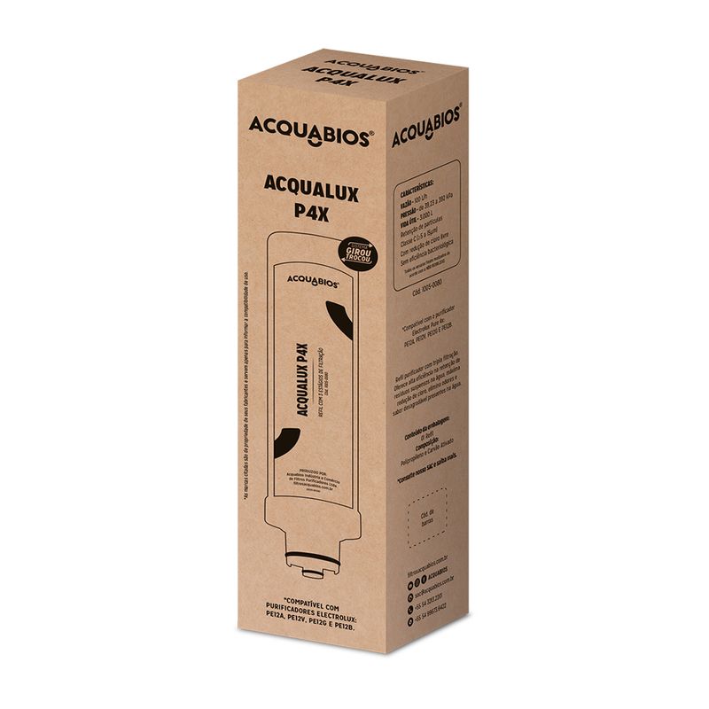 Descrição: O Refil Acqualux P4X (Pure) para Purificadores Electrolux – 1005-0080 – Acquabios é a escolha ideal para manter o desempenho e a qualidade da água do seu purificador sempre em alto nível. Indicado para reposição no purificador Electrolux Pure 4x*, este refil conta com sistema de tripla filtração, garantindo alta eficiência na retenção de partículas suspensas, máxima redução de cloro livre e eliminação de odores e sabores desagradáveis presentes na água. Produzido com materiais de alta qualidade e desenvolvido para proporcionar excelente vazão e durabilidade, o refil oferece mais segurança e praticidade no dia a dia. Fabricado pela Acquabios, é a solução ideal para quem busca água mais limpa, cristalina e agradável para consumo.