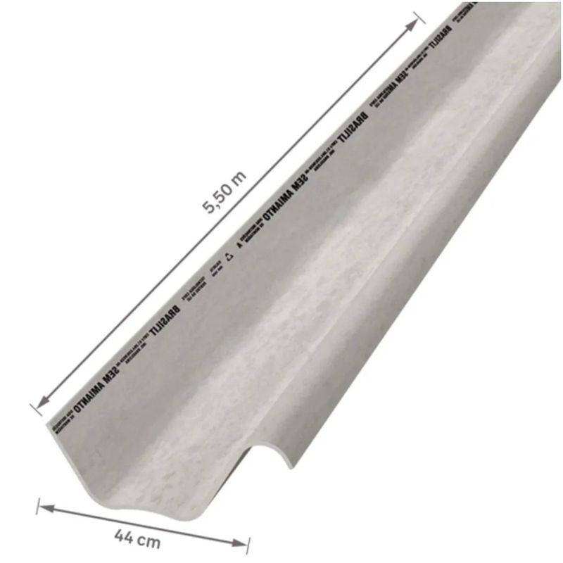 A Telha de Fibrocimento Ondulada Kalheta, da Brasilit, mede 44 cm de largura por 5,50 m de comprimento (dimensão 44 × 550 cm), possui espessura de 8 mm e cor cinza.