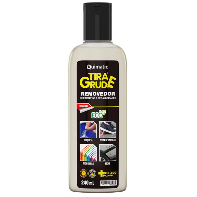 - O Tira Grude da Quimatic é o original removedor de cola de adesivos, chicletes, piche de asfalto, gordura, giz de cera, entre outra sujeiras pegajosas. Único que permite aplicação em superfícies de acrílico, plásticos, PVC e similares. A formulá do Tira Grude é totalmente ecológica e portencializada com força cítrica e aloe vera em sua composição, tornando-o isento de solventes nocivos e metais pesados.