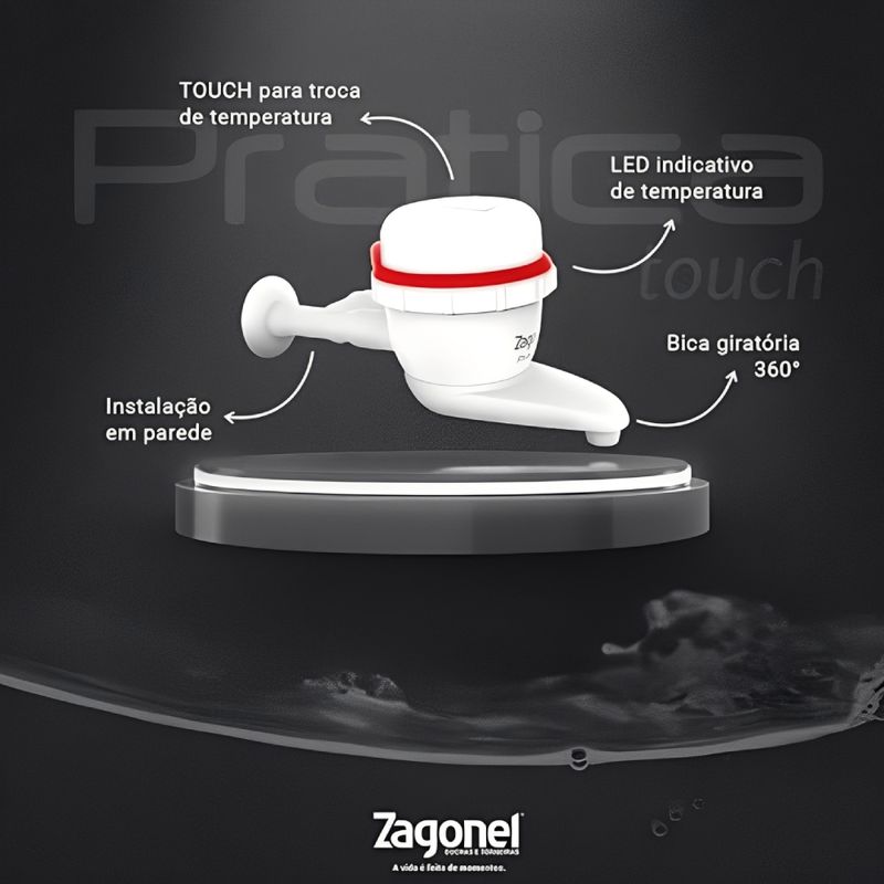 Apresentamos a torneira eletrônica Prática Touch da Zagonel — modelo projetado para máxima praticidade e conforto no uso diário. Com potência de aproximadamente 5 500 W, versões em 127 V ou 220 V, instalação possível tanto em parede quanto em bancada, acabamento em cor branca (ou outras versões conforme SKU) e tecnologia avançada de controle de temperatura via toque (Touch) e acionamento “One Touch” para temperaturas máxima ou mínima. A torneira conta ainda com LED indicador de temperatura e bica giratória de 360°, ideal para cozinhas e áreas de serviço que exigem versatilidade, design moderno e eficiência.